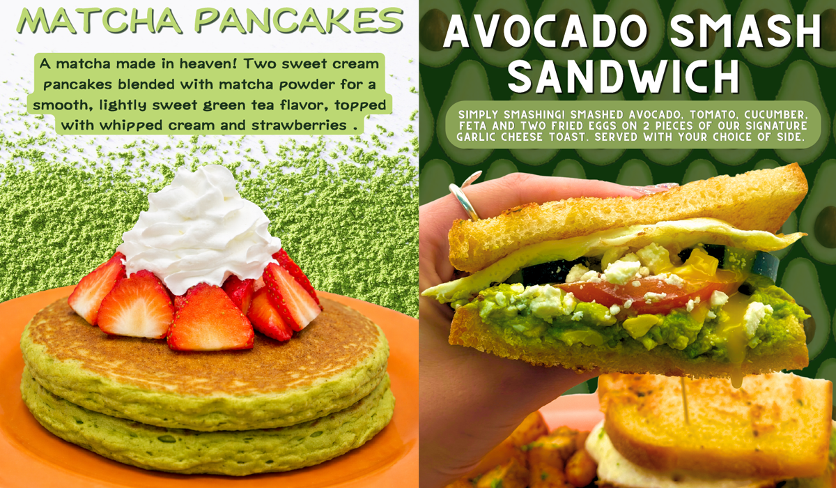 The Matcha Pancakes bring a playful twist to a breakfast favorite, while the Avocado Smash Sandwich delivers the hearty, savory satisfaction that makes brunch so special.